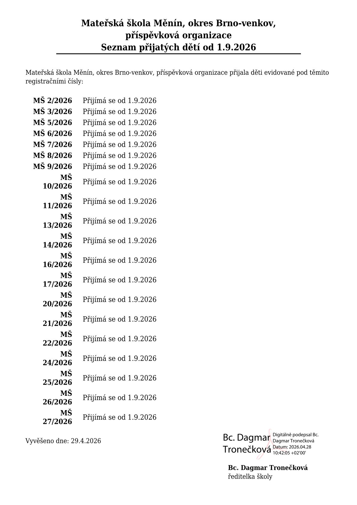 Ředitelka Mateřské školy Měnín, okres Brno-venkov, příspěvková organizace, jako příslušný správní orgán podle § 34, § 165 odst. 2 písm. b) a § 183 odst. 2 zákona č. 561/2004 Sb., školský zákon, ve znění pozdějších předpisů, rozhodla, že děti s níže uvedenými registračními čísly byly přijaty k předškolnímu vzdělávání od 1. 9. 2026.